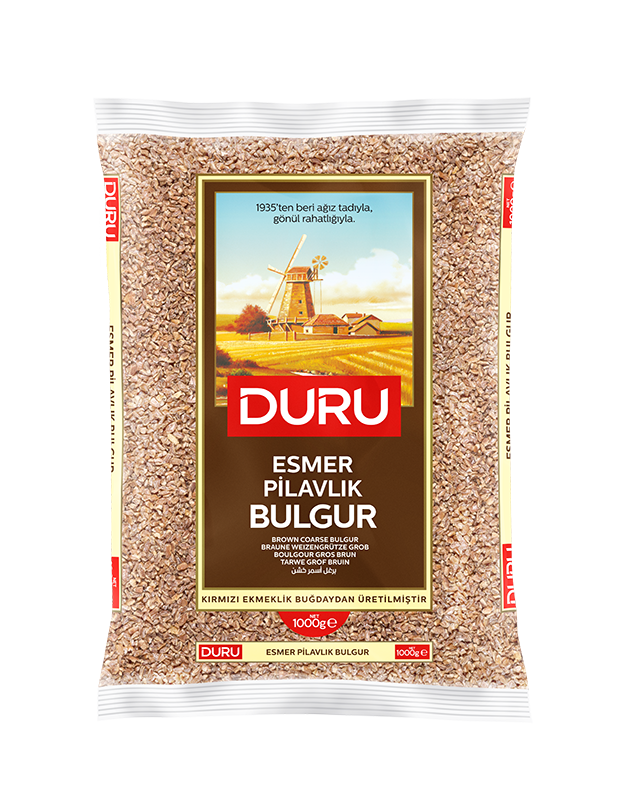 Duru Esmer Pilavlık Bulgur, doğal taş değirmen teknolojisiyle üretilir ve kepekli yapısı sayesinde lif, bitkisel protein, mineral ve vitamin bakımından zengindir. En kaliteli buğdaylarla, ISO 22000, IFS ve BRC sertifikalarına sahip fabrikalarda işlenen bu bulgur, çorba, pilav, salata ve daha birçok yemekte kullanılabilir.