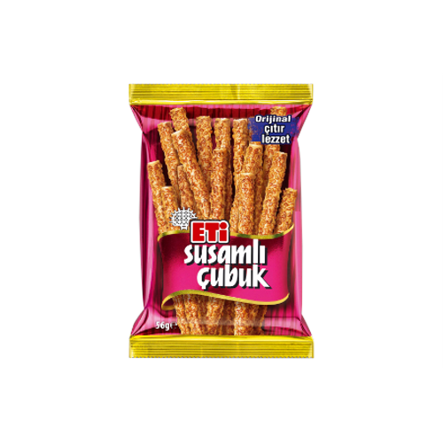 Kavrulmuş susamla kaplı, kıtır kıtır ETİ Susamlı Çubuk. Hem gevrek, hem lezzetli, hem doyurucu bu kraker sizi çocukluk anılarınıza geri götürüyor.