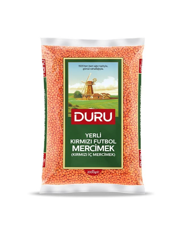Duru Yerli Kırmızı Futbol Mercimek, lif, bitkisel protein ve mineral bakımından zengin, oldukça lezzetli bir mercimek çeşididir. Güneydoğu Anadolu Bölgesi'nde yetişir ve yaygın olarak çorba, köfte ve salatalarda kullanılır. ISO 22000, IFS ve BRC sertifikalarına sahip fabrikalarda yüksek kaliteyle paketlenir.