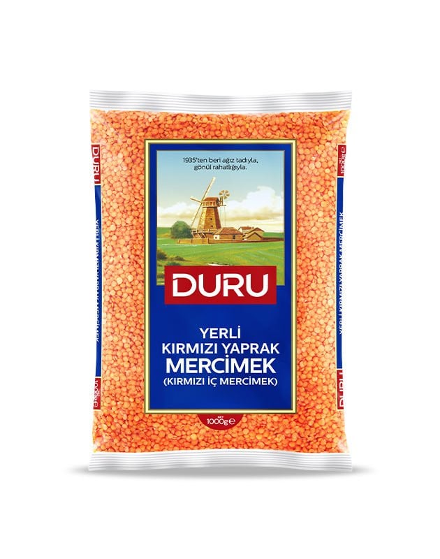 Duru Yerli Kırmızı Yaprak Mercimek, kırmızı futbol mercimeğin kırılmasıyla elde edilen, lif, bitkisel protein ve mineral açısından zengin, lezzetli bir mercimek çeşididir. Güneydoğu Anadolu Bölgesi'nde yetişir ve çorba, köfte, salata gibi tariflerde kullanılır. ISO 22000, IFS ve BRC sertifikalarına sahip fabrikalarda yüksek kaliteyle paketlenir.